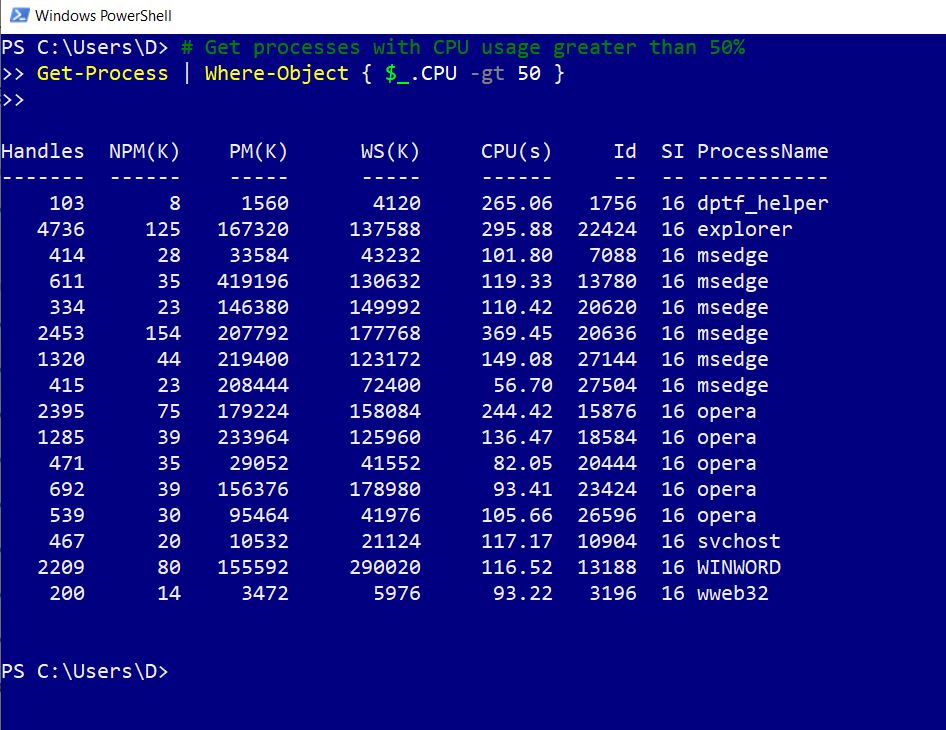 Then using Where-Object, we filter the list of processes and select ones whose CPU usage is greater than 50%.